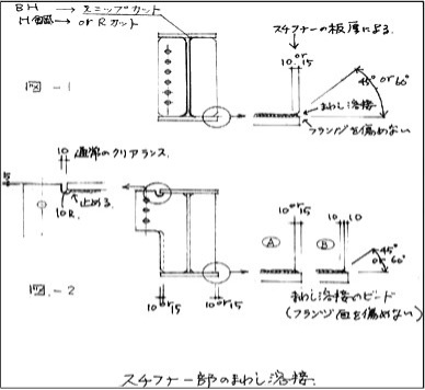 ② 図-2においては、小梁取り合いのガセットプレートの例で10R(梁接合部のクリアランス10mmに見合った)加工の例です。この場合は10R止まりの所で隅肉溶接ビードを止めるような溶接とします。