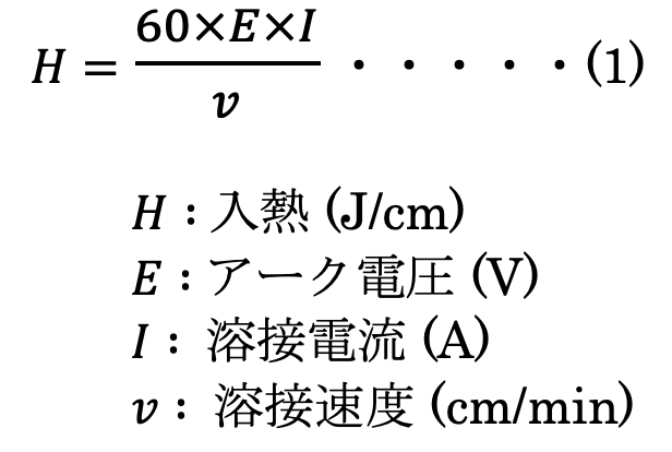 入熱量は式(1)より算出され、電流・電圧及び溶接速度に依存します。現在入熱量の管理方法で多く採用されている方法はパス数の管理です。パス数が多くなれば、1パス当りの溶接速度が大きくなり入熱量はおのずと小さくなる為、板厚毎に溶接積層図をあらかじめ設定しておけば入熱量の管理は比較的簡単に行なえます。
