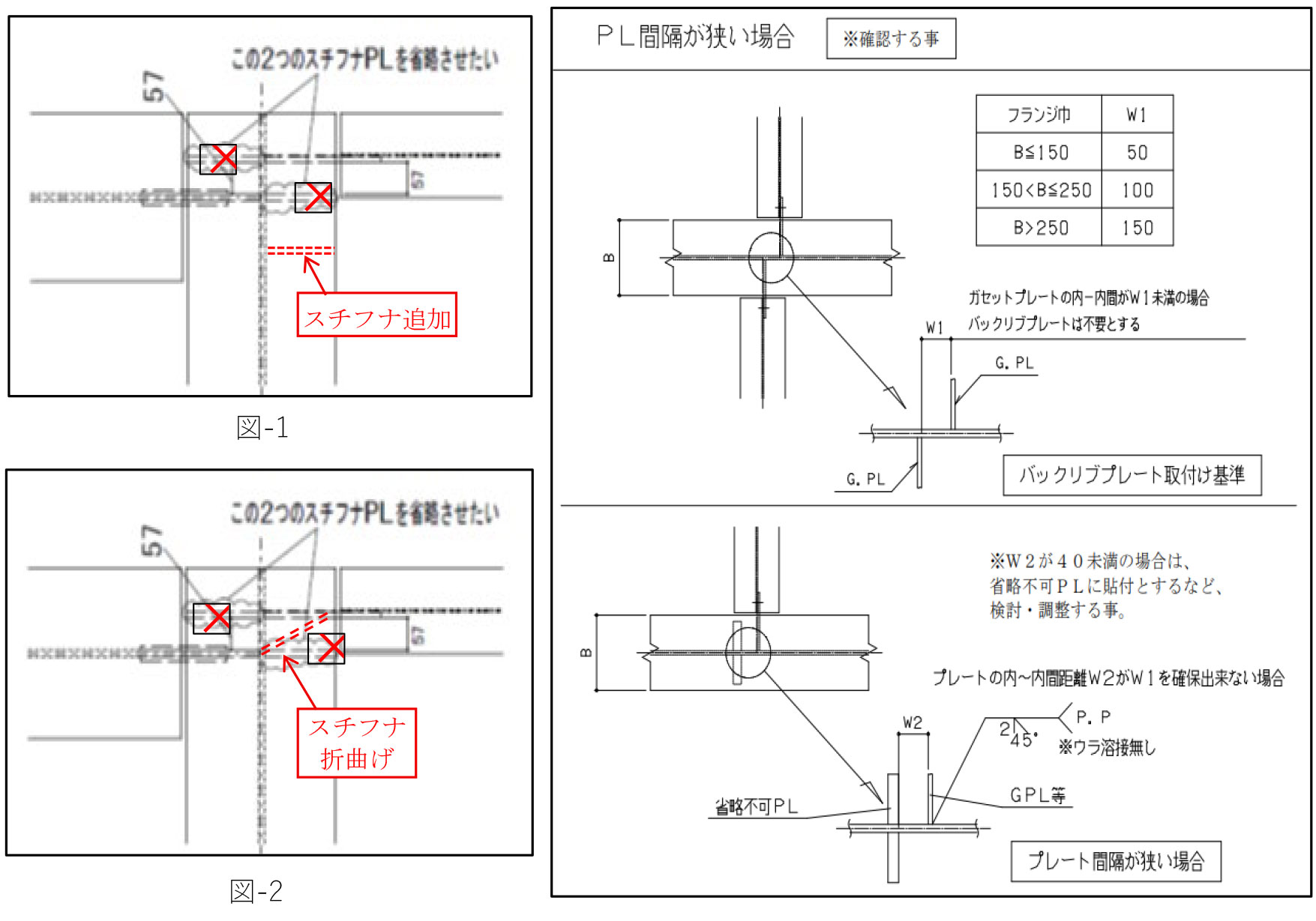 ガセットPLの位置の違いが片フランジの1/2程度以下であれば,省略してもよいと考えられます。スチフナを省略できないと判断された場合は,図-1のように必要な間隔をあけて設置する方法や,製作者は板の折曲げを嫌う傾向がありますが,図-2のようにB3のガセットPLを折り曲げて取り付ける方法があります。