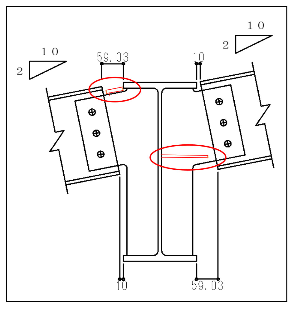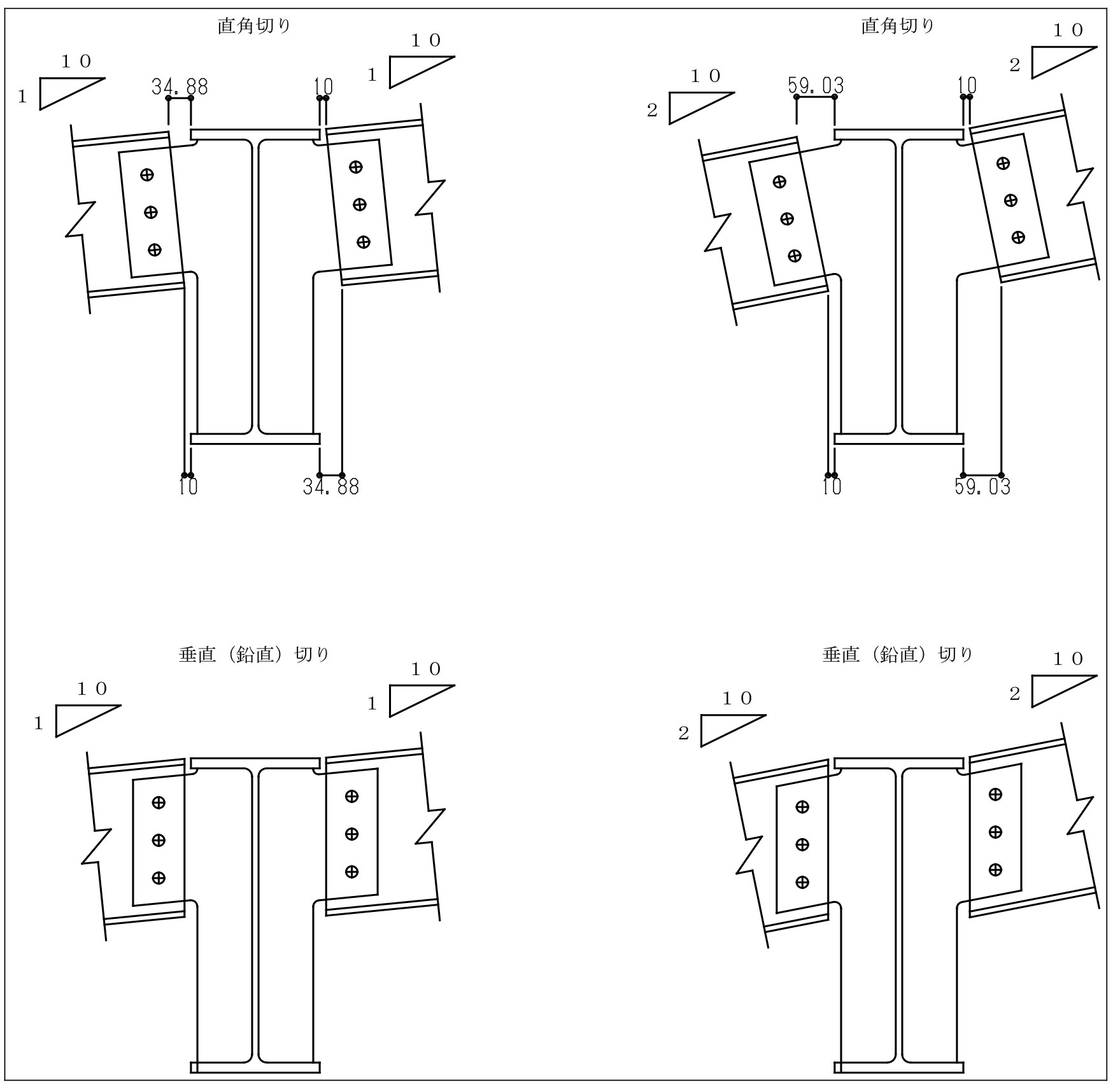 などの補強を行うと,板座屈耐力が上がり直角切りの可能性が出てきます。あるいは,勾配梁のフランジを切り落として追い込むという方法も考えられますが,建て方時垂直に下せなくなったり,材料費や製作工数が増えたりすることになりますので,鉄骨製作者側の判断になります。