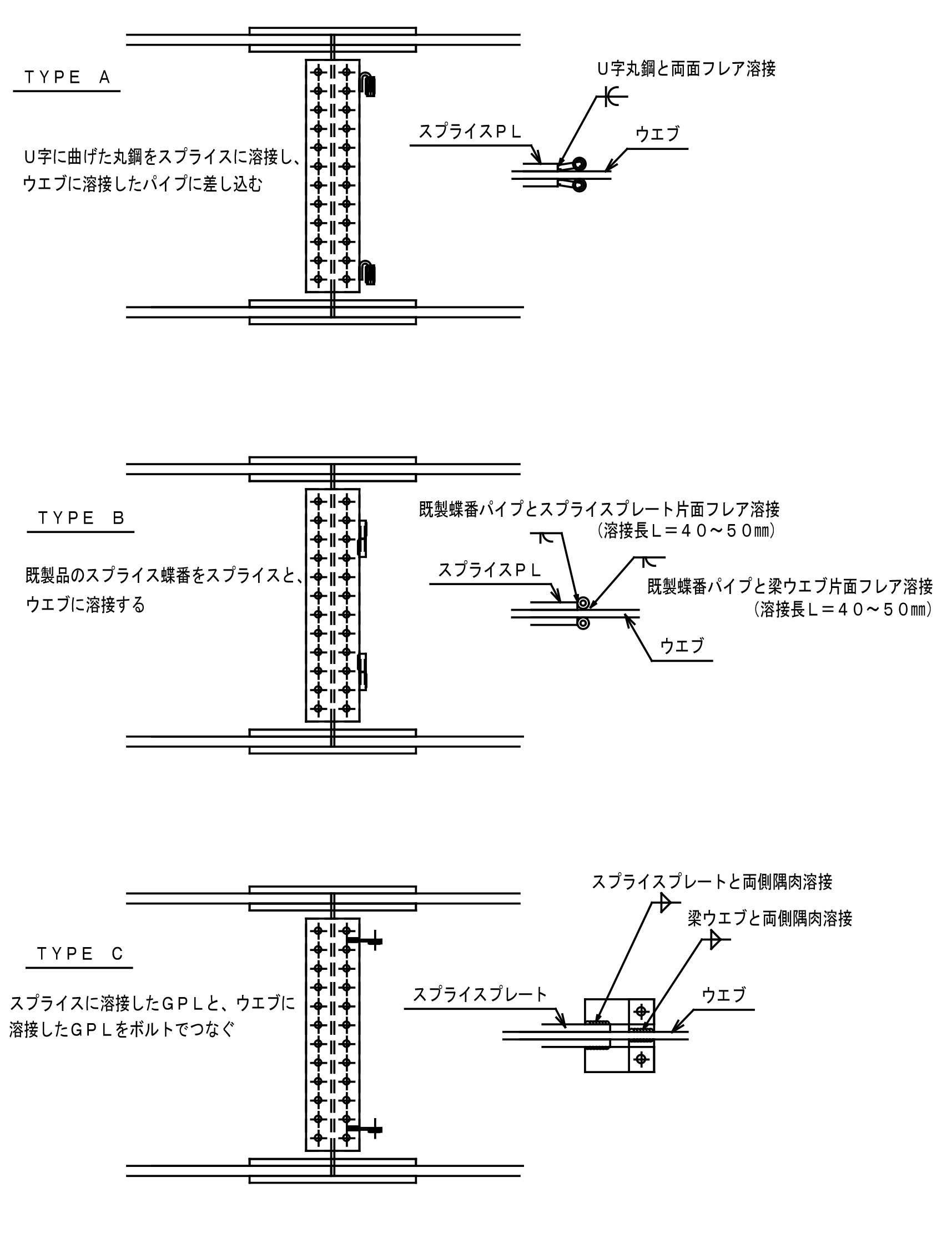 TYPE−BもスプライスPLの小端に取り付ける仕様ですが,片面フレア溶接でありTYPE−Aのようにスプライスへの密着の心配はありません。ただし,片面溶接のため溶接を適正に行うことが大切です。脚長が不足したり溶接欠陥が内在したりすると,思いかけない衝撃などで破断する可能性があります。
